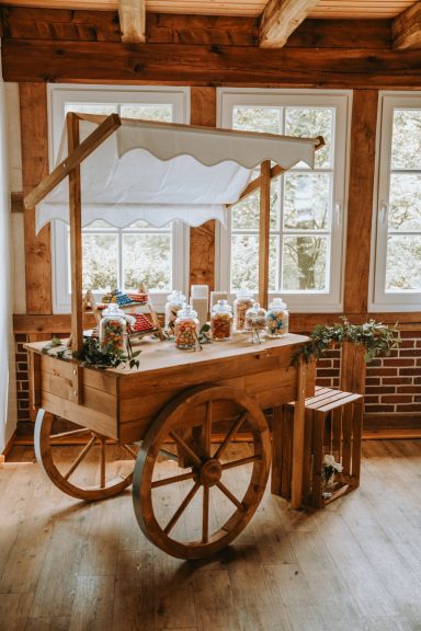 Ein Highlight: Unser Marktwagen, der vielseitig einsetzbar ist – ob als Candybar, für den Sektempfang oder den Tortenanschnitt.