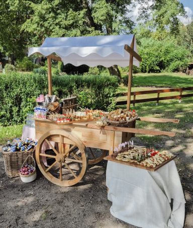 Ein Highlight: Unser Marktwagen, der vielseitig einsetzbar ist – ob als Candybar, für den Sektempfang oder den Tortenanschnitt.